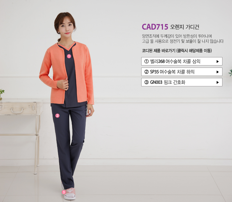 大碼(99含)以上 上衣加400元◆褲子加200元 √ 顏色可能會因顯示器的亮度、對比度和照明而有所不同。 面料特點 50% 棉,50% 聚脂纖維 由於它是一種有彈性的材料,洗滌時必須小心,以免變形。 購買後第一次乾洗,保持美麗長久。 由於其編織緊密,因此具有良好的保溫性。 織物厚度 CAD715 橙色 整齊落下的利落開襟圓型開衫。 兩面質地厚實,防寒性極佳 不易產生靜電和絨毛,是一款管理和保存良好的產品。 它是一種可以輕鬆穿在護理服和手術服上的物品。